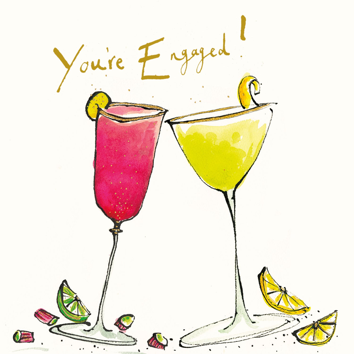 A gold foil embossed engagement card illustrated with two tasty cocktails and the handwritten text ’You're Engaged!'.