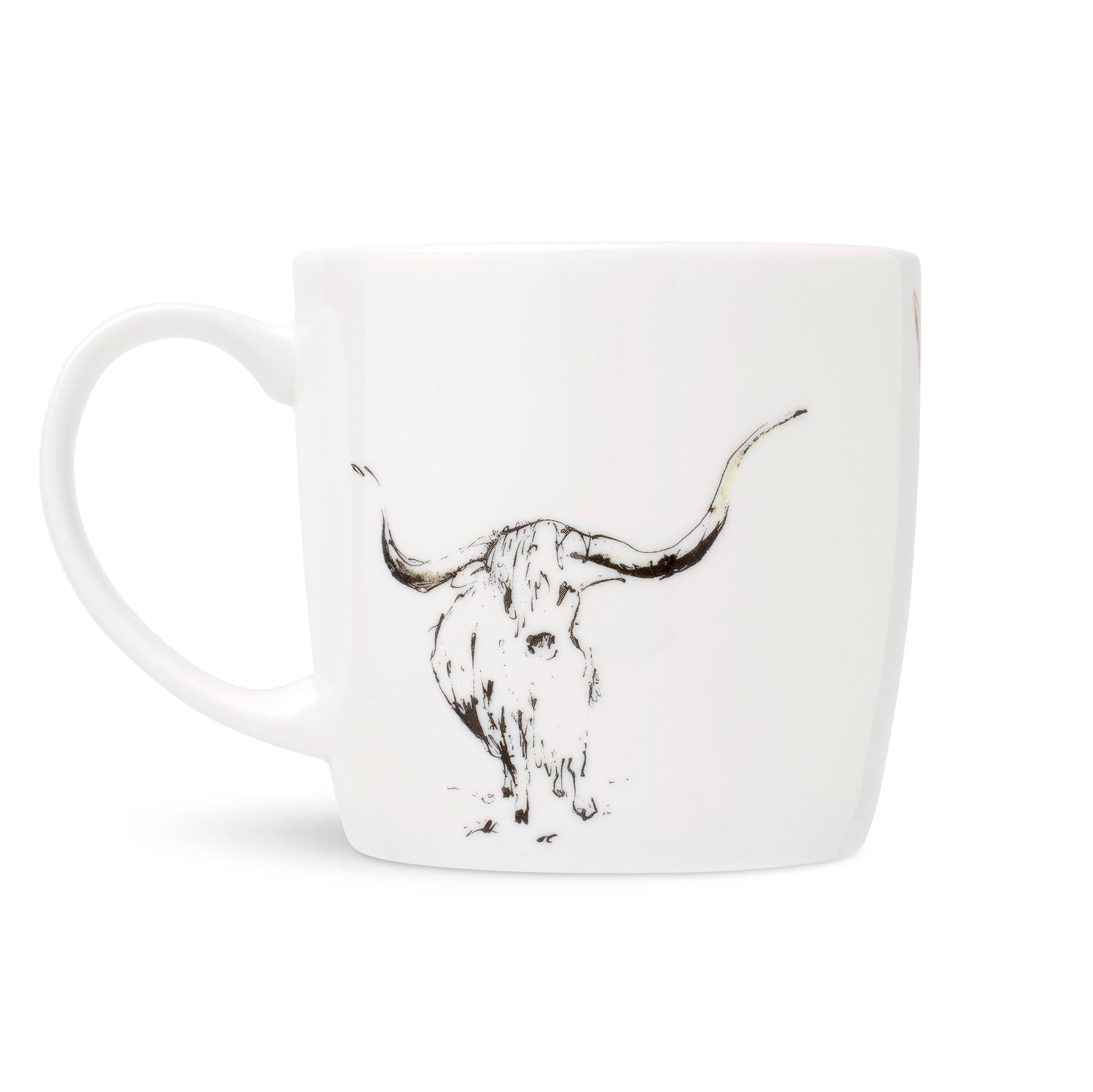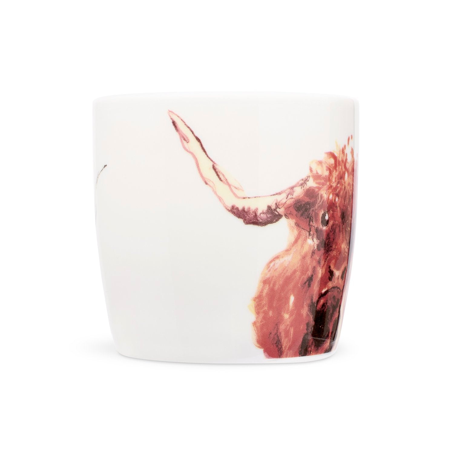 A fine bone china mug made in the UK. Illustrated with a moody looking Highland Cow on the outside, the handwritten text ‘Moody Mornings’ on the inside of the lip and a flower inside on the base, so there’s a wee surprise , to cheer you up, when you finish your cup of tea…