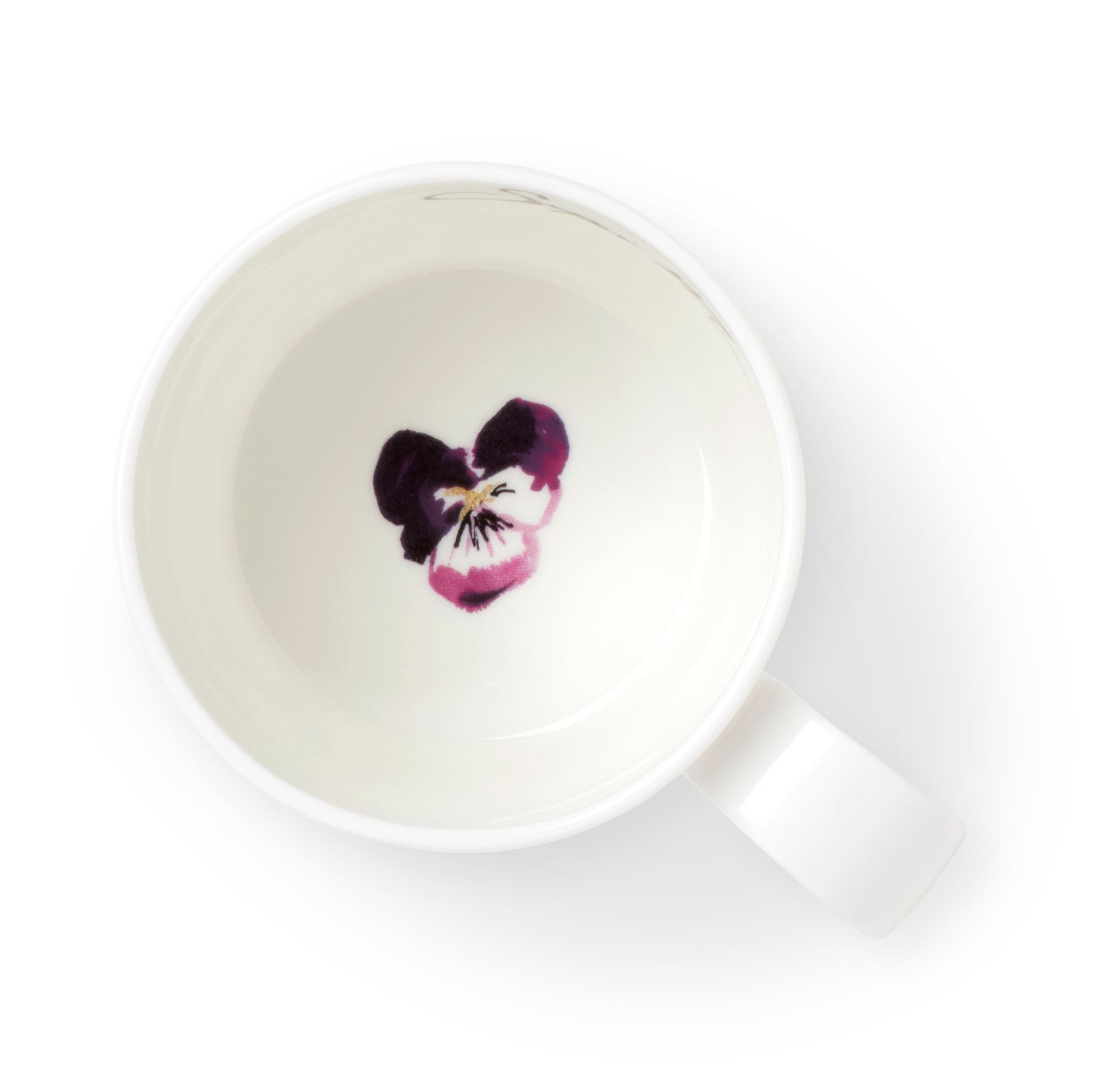 A fine bone china mug made in the UK. Illustrated with a bee flying amongst the colourful flowers on the outside, the handwritten text ‘Super Mum’ on the inside of the lip and a purple flower inside on the base, so there’s a wee surprise when you finish your cup of tea…