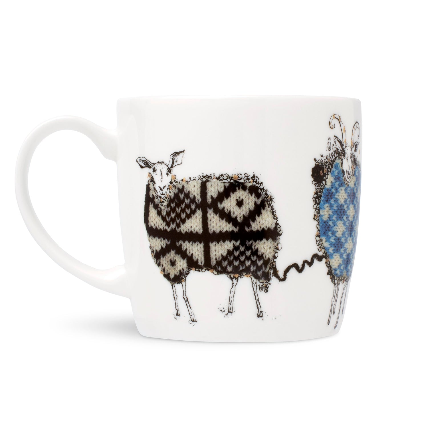 A fine bone china mug made in the UK. Illustrated with four jumper wearing sheep on the outside, the handwritten text ‘The Knitting Circle’ on the inside of the lip and a lone sheep inside on the base, so there’s a wee surprise when you finish your cup of tea…