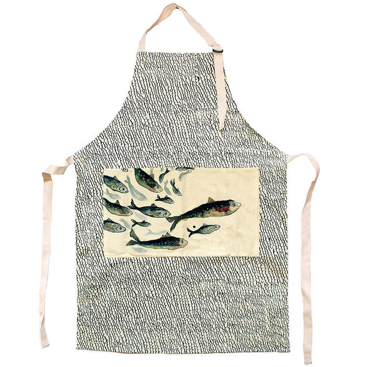 An apron illustrated with a shoal of simmering herrings on the pocket, a hand-drawn blue pattern.