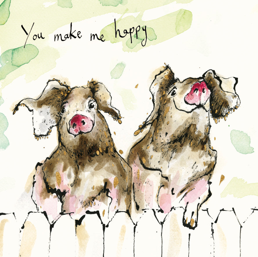 A greetings card illustrated with a pair of gleeful pigs and the handwritten text ‘You make me happy’.