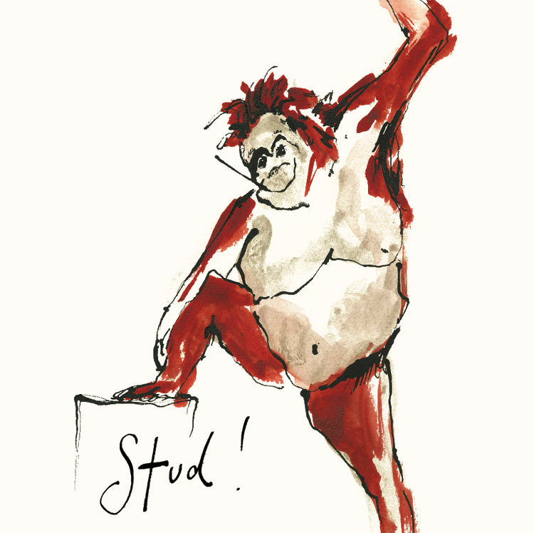 A card illustrated with a handsome orangutan and the handwritten text ‘Stud!’.