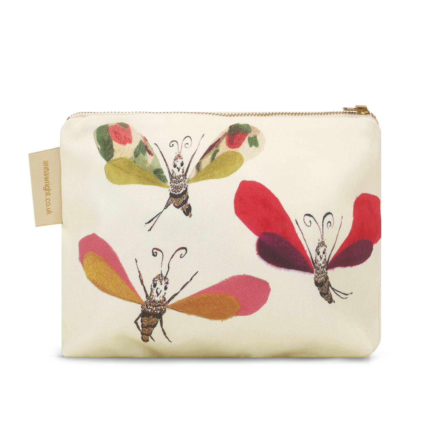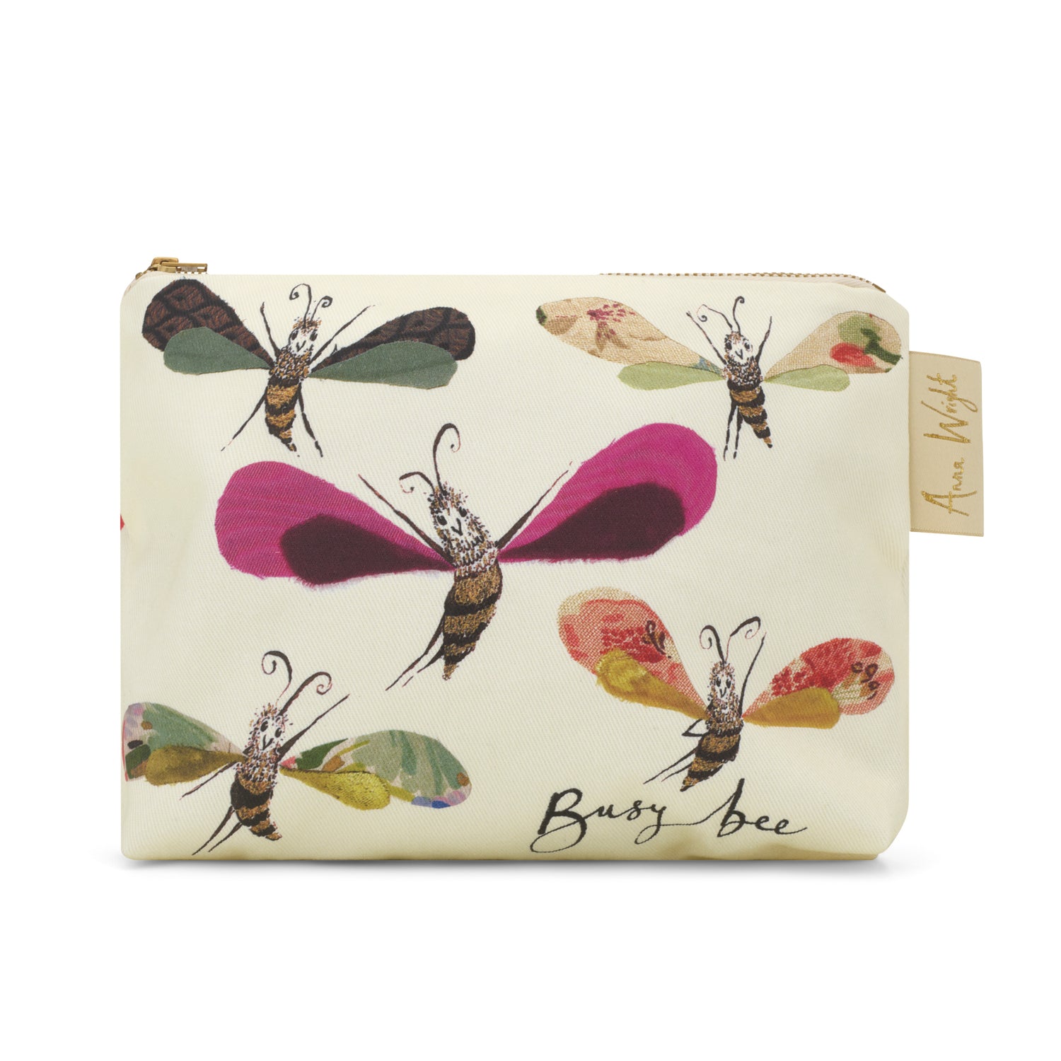 A handmade cotton make-up bag illustrated with a cluster of colourful happy bees and the handwritten text ‘Busy Bee’ on the front, and three happy bees on the back.