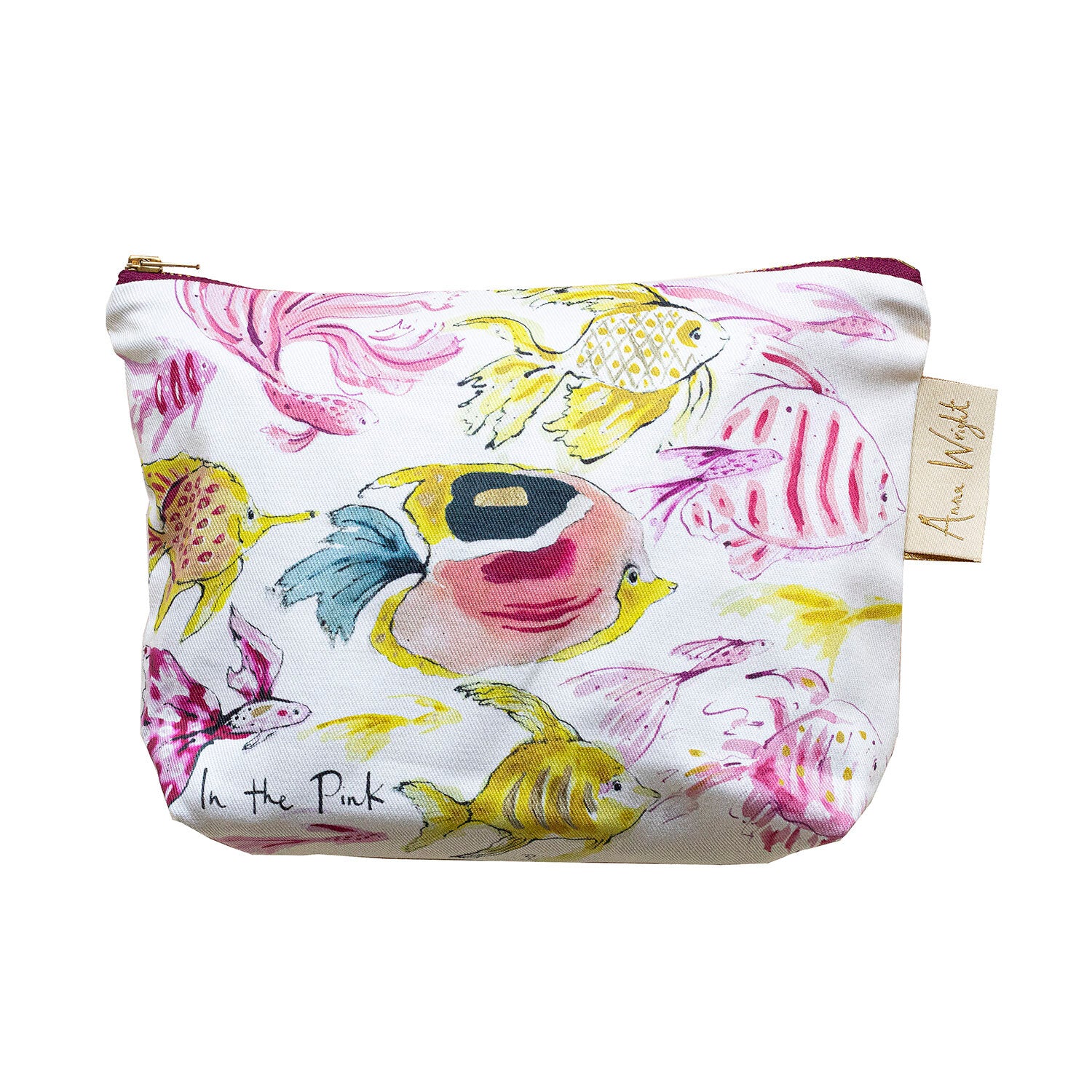 A handmade cotton make-up bag illustrated with a shoal of pink and yellow fish and the handwritten text ‘In the Pink’ on the front, and a colourful pink pattern on the back.