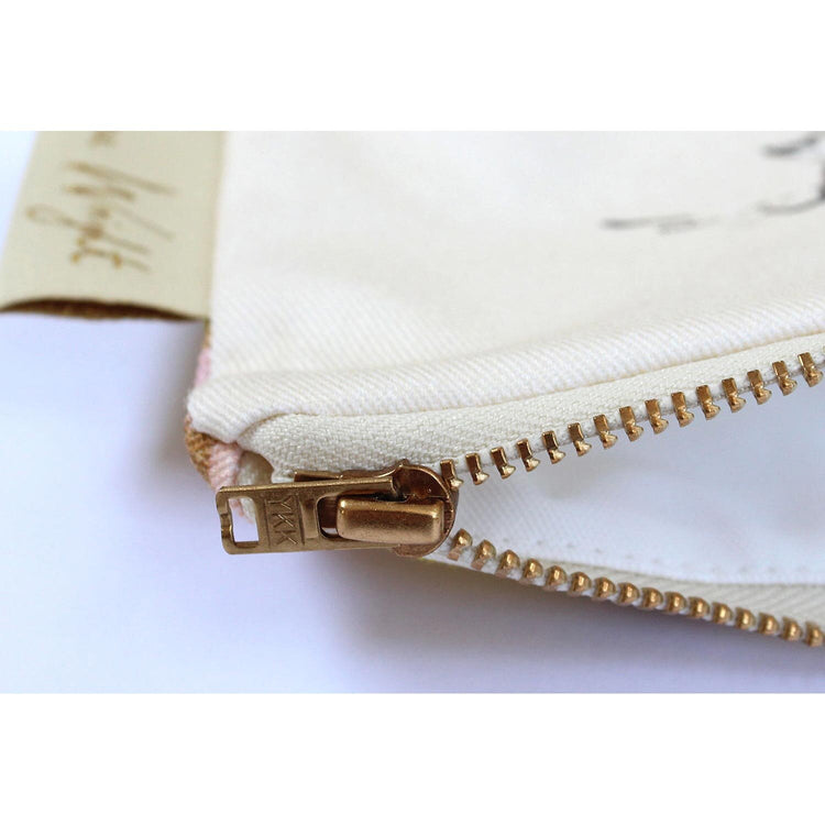 - Printed onto a cotton cloth outer with a sturdy waterproof lining and a high-quality solid brass zip