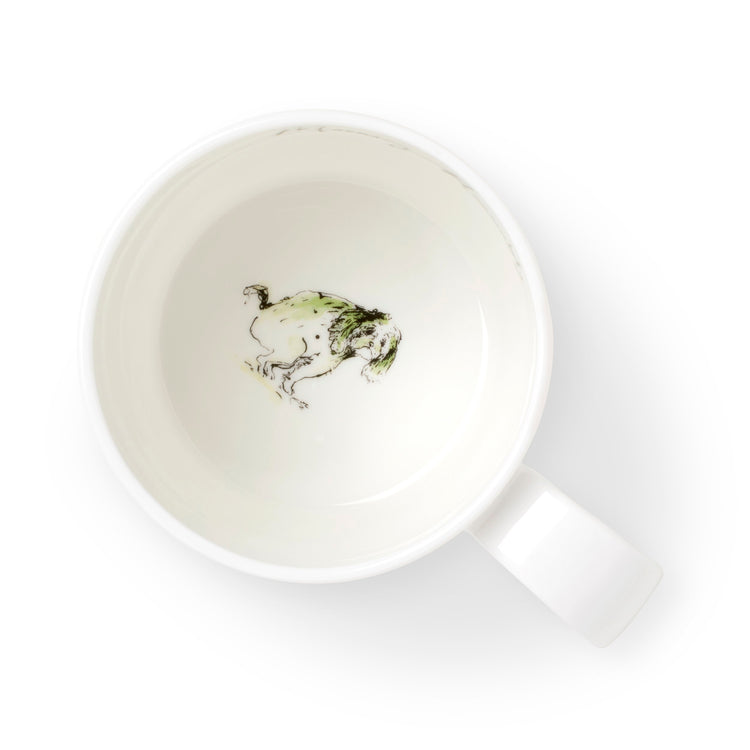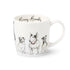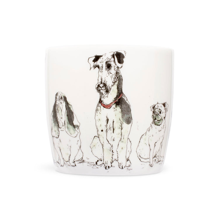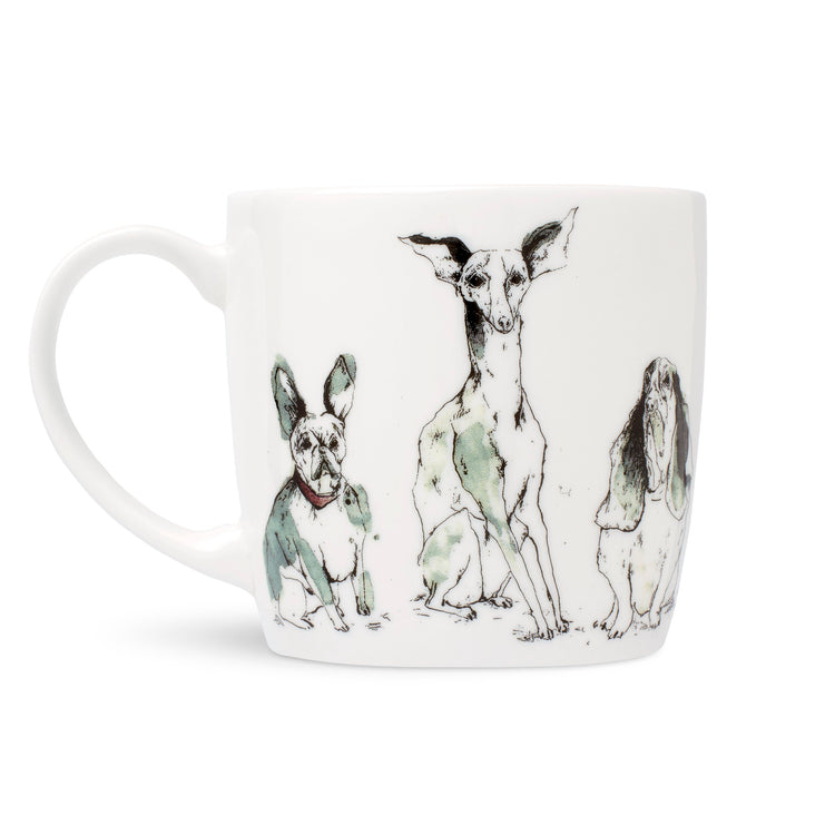 A fine bone china mug made in the UK. Illustrated with five assembled dogs on the outside, the handwritten text ‘Morning Assembly’ on the inside of the lip and a sitting dog inside on the base, so there’s a wee surprise when you finish your cup of tea…