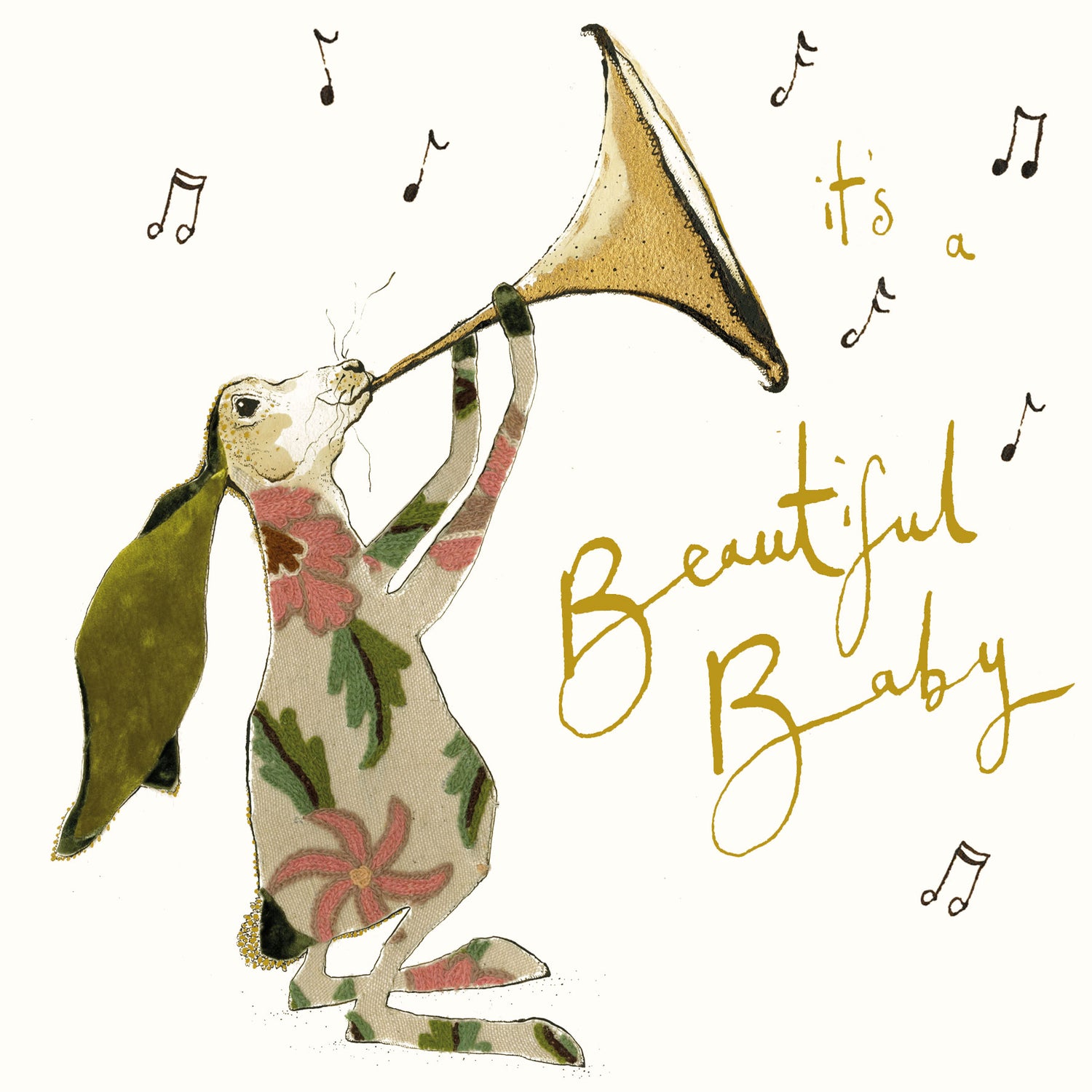 A gold foil embossed new baby card illustrated with a trumpeting hare and the handwritten text ‘it's a Beautiful Baby’.