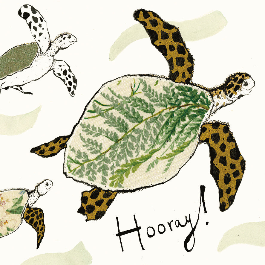 A greetings card illustrated with three happy Turtles and the handwritten text ‘Hooray!’.