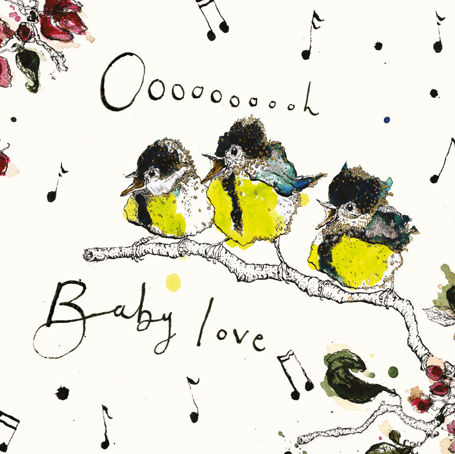A greetings card illustrated with three singing blue tits and the handwritten text ‘Oooooooooh Baby love.