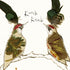 A greetings card illustrated with two, feather plumed, green woodpeckers and the handwritten text ‘Knock Knock’.