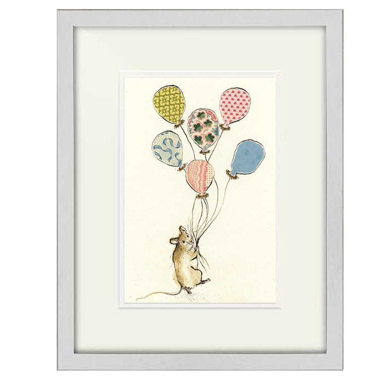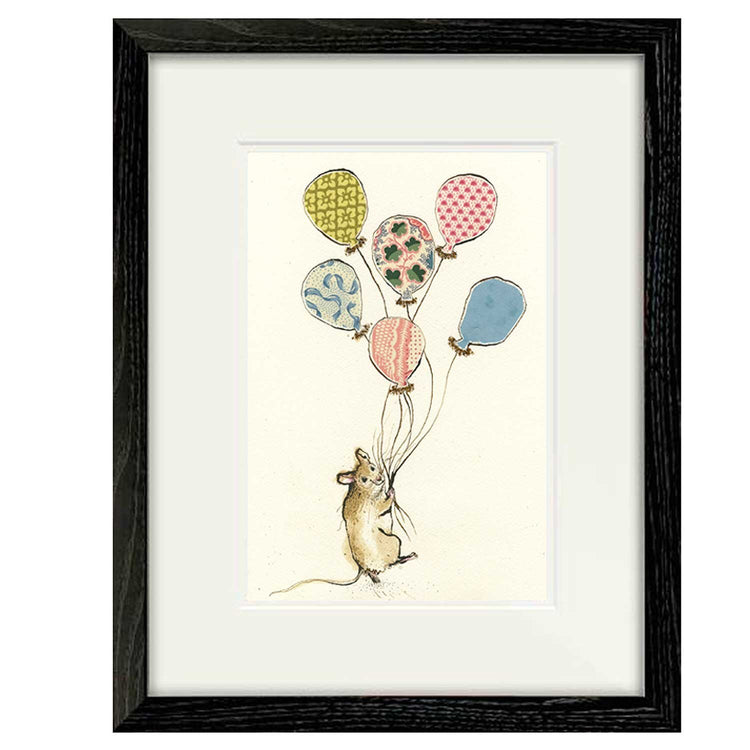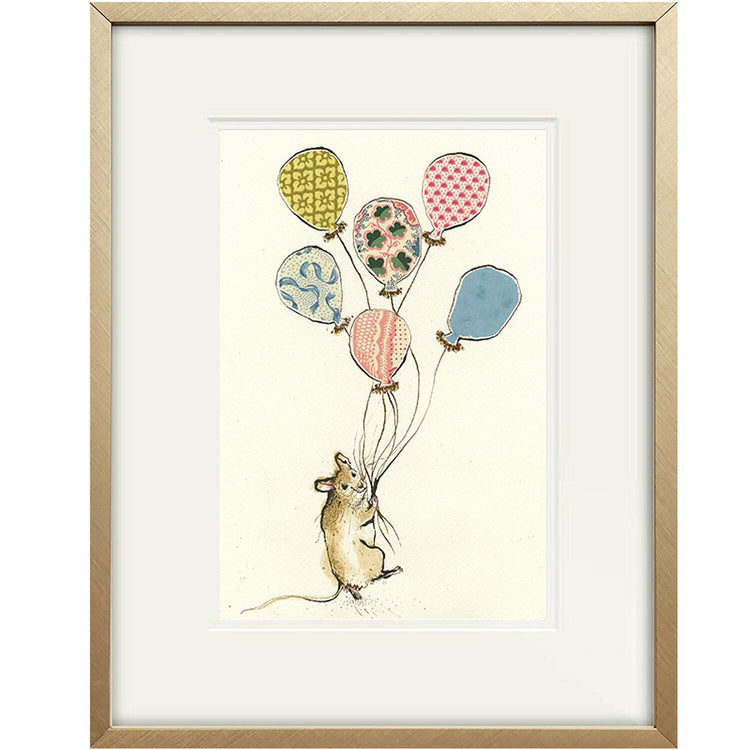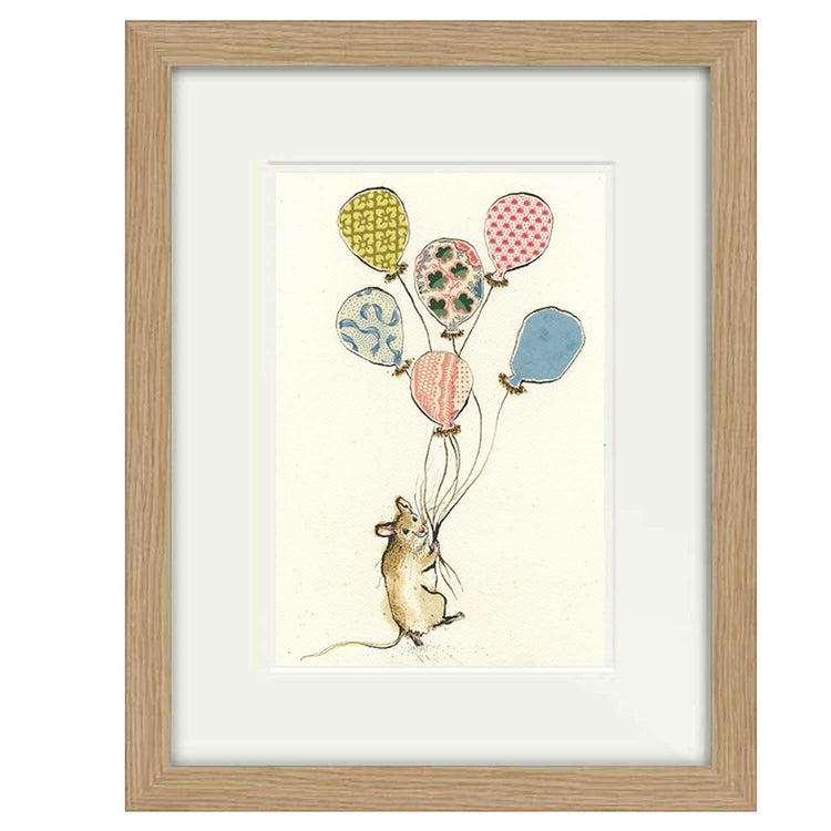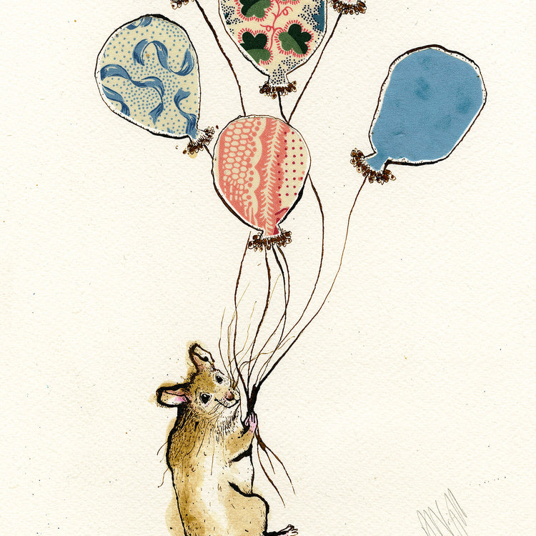 A high-quality giclee print of a little mouse and his colourful balloons.