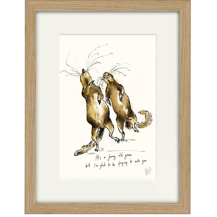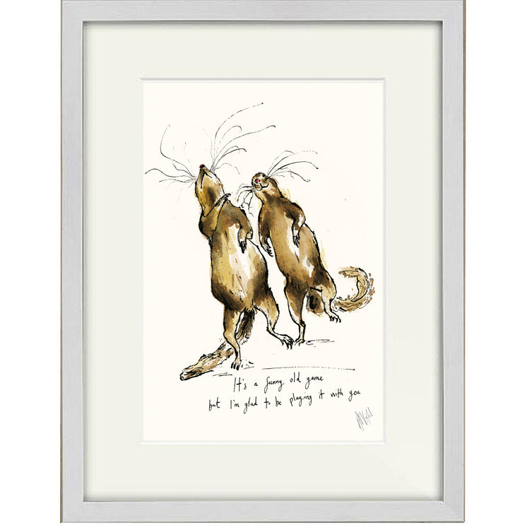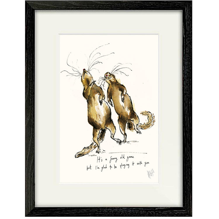 A high-quality giclee print of two happy skipping Ground Squirrels and the handwritten text ‘It’s a funny old game but I’m glad to be playing it with you’.