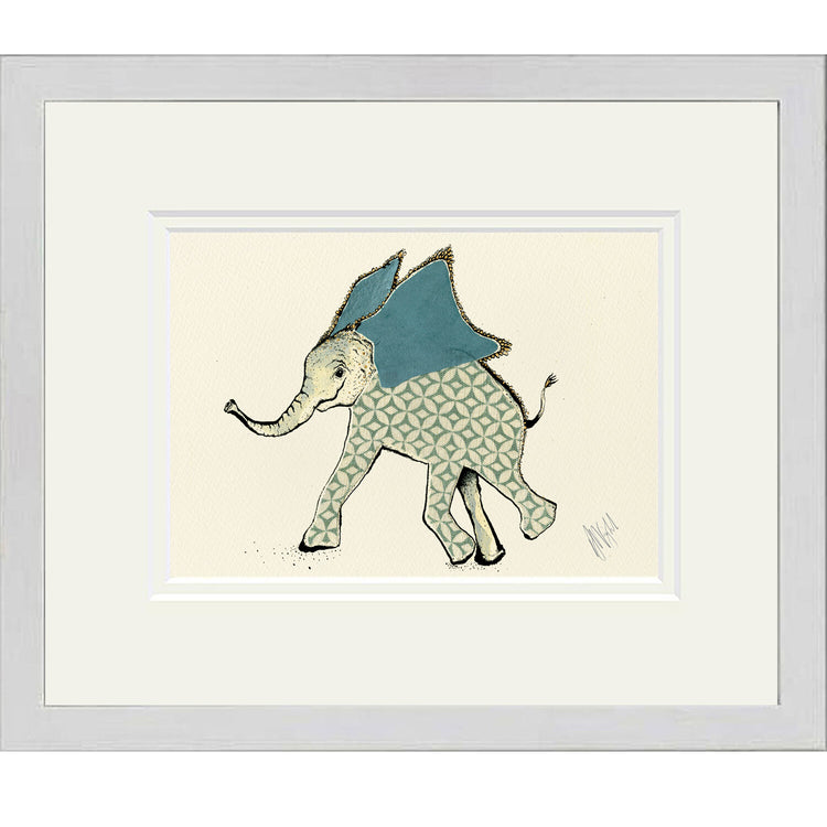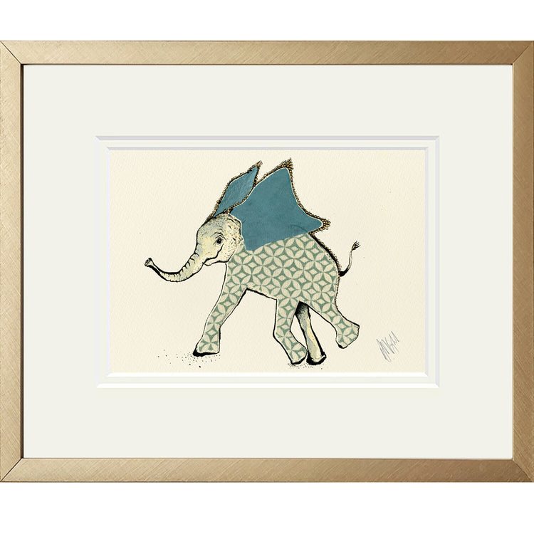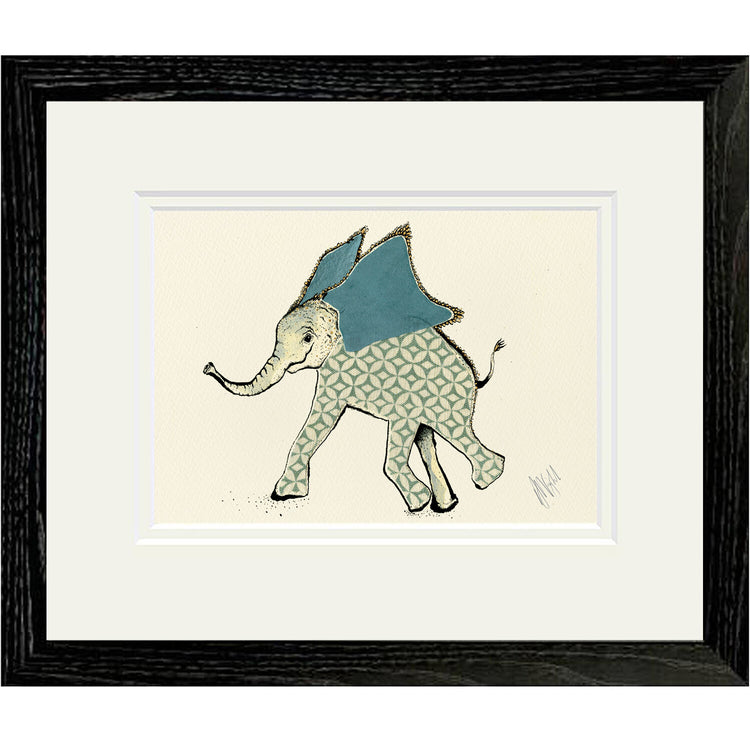 A high-quality giclee print of a playful little elephant with his big velvety ears flapping as he runs.
