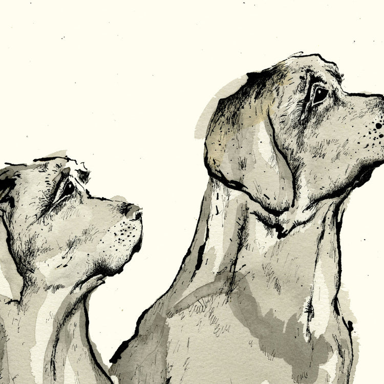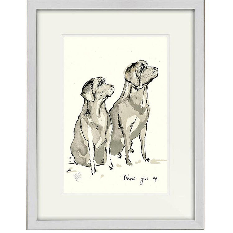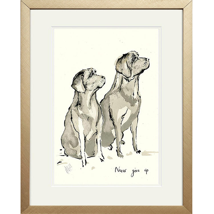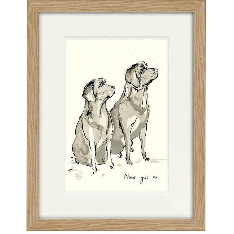 A high-quality giclee print of two loyal Labradors, with the handwritten text 'Never give up'.