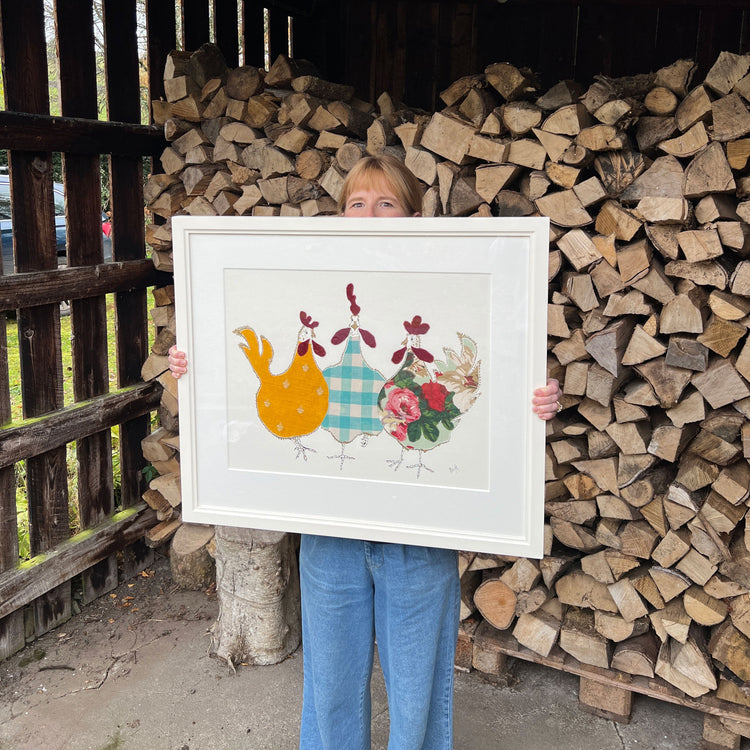 An original artwork of three fancifully dressed hens.